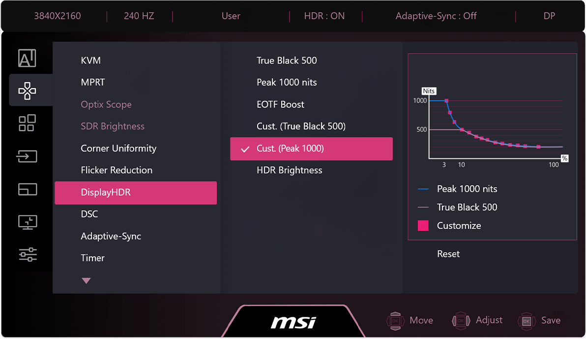 Uniform Luminance grants you fully customizable HDR brightness for precise control on the MPG 322UR QD-OLED X24. By fine-tuning points on the curves, it prevents sudden, aggressive dimming and ensures seamless transitions, delivering smoother visuals tailored to your preference.