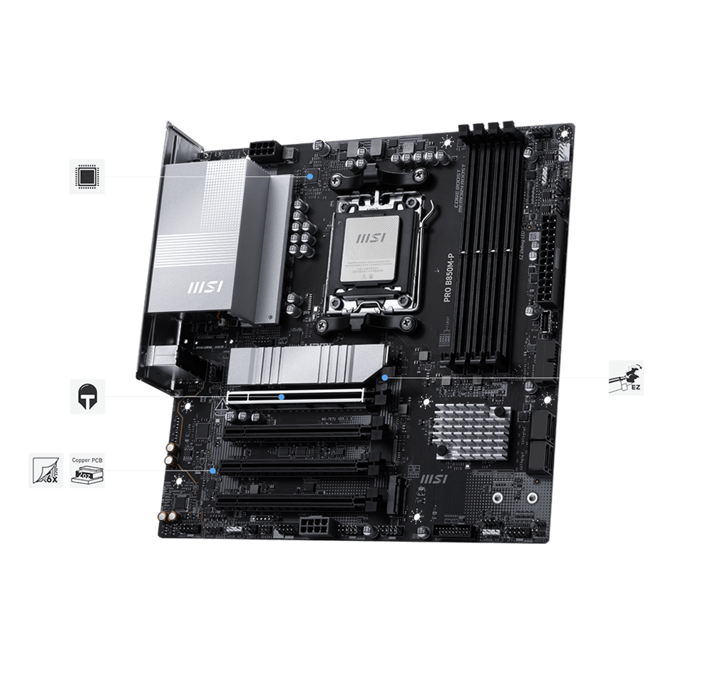 PRO B850M-P offers a simple design with a harmonious silver color scheme that perfectly matches both white and black PC builds. It is engineered with many exclusive features of MSI, 5G LAN, EZ PCIe Clip II, PCIe 5.0 M.2 with EZ M.2 Shield Frozr II, and Supplemental PCIe Power, ready for the AMD Ryzen™ 9000 series processors.