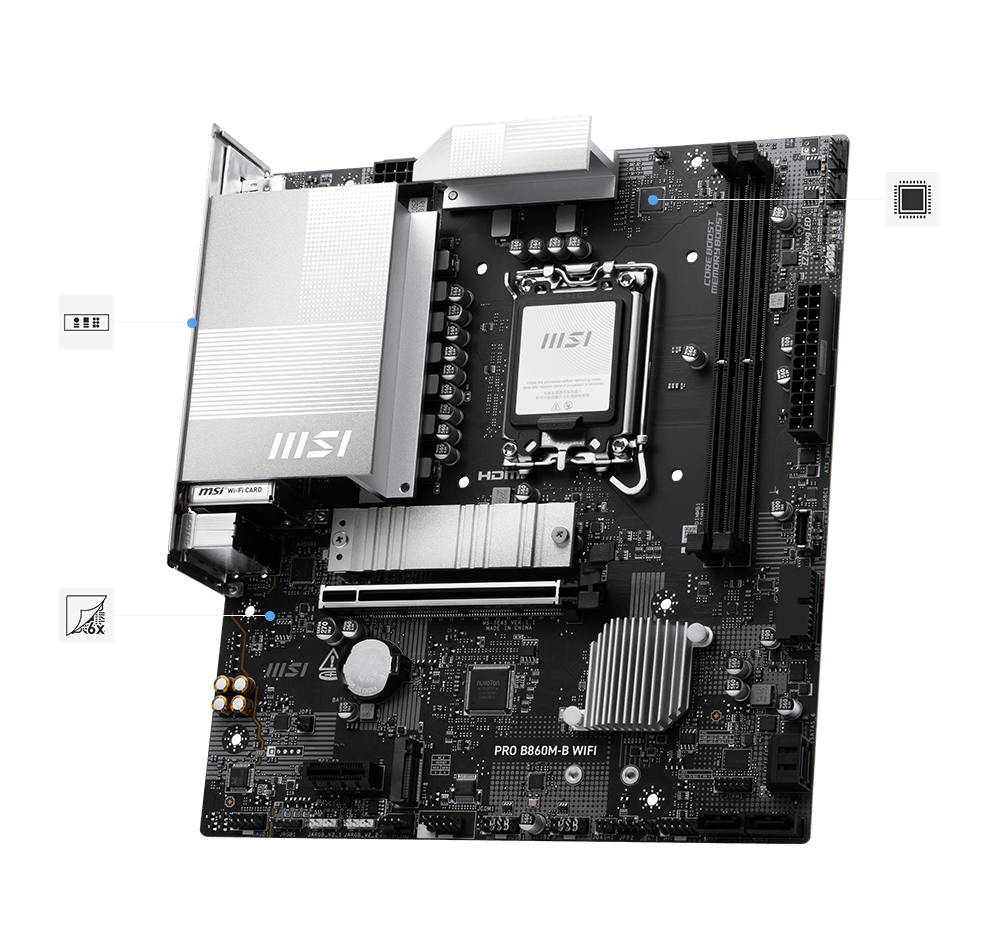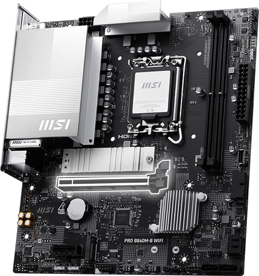 PRO B860M-B WIFI offers a simple design with a harmonious silver color scheme that perfectly matches both white and black PC builds. It is engineered with many exclusive features of MSI, a Wi-Fi 7 with EZ Antenna, 5G LAN, and PCIe 5.0 M.2, ready for the Intel® Core™ Ultra processors.
