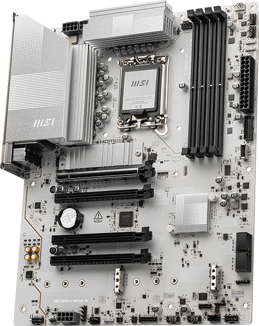 PRO Z890-S WIFI6E W offers a simple design with a harmonious silver-white color scheme that perfectly matches white PC builds. It is engineered with many exclusive features of MSI, a Wi-Fi6E with EZ Antenna, 2.5G LAN, PCIe 5.0 M.2, and Supplemental PCIe Power, ready for the Intel® Core™ Ultra processors.