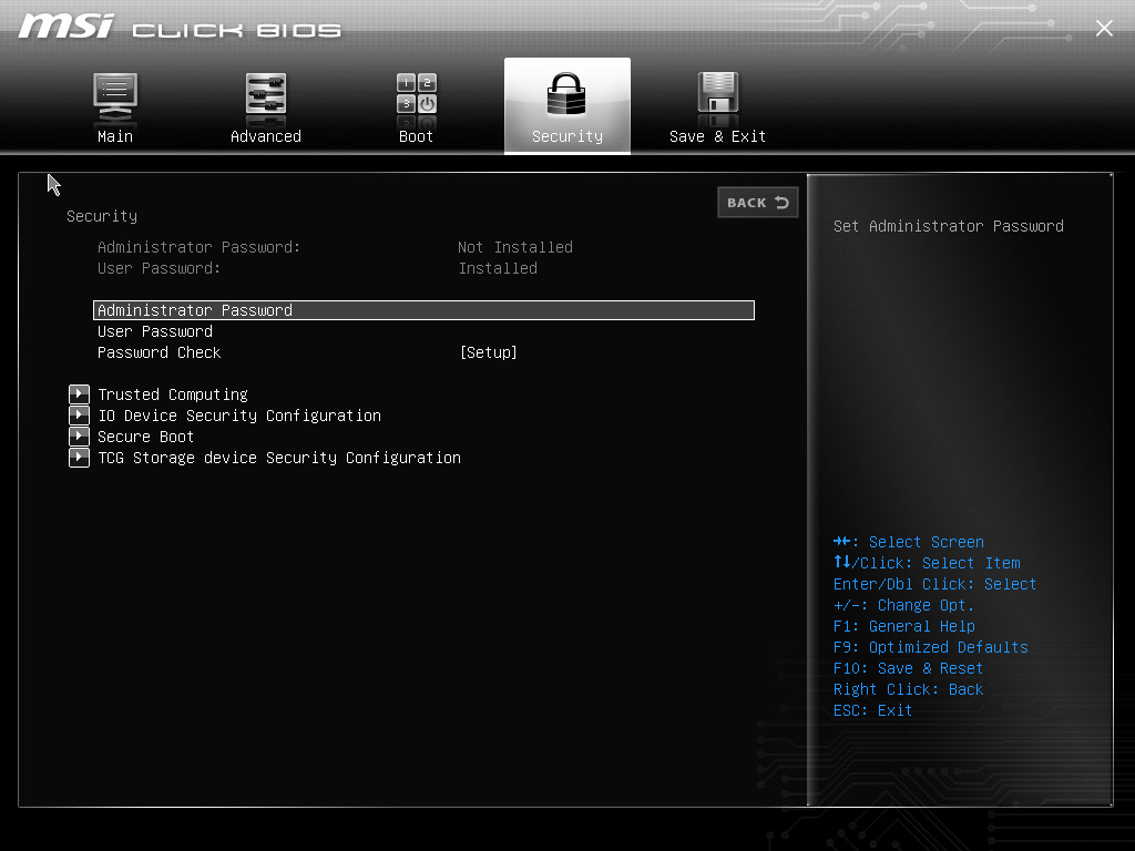 2. Go to Security > Administrator Password or User Password to initiate the BIOS password.